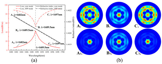 When the gold film thickness is 30 nm and the air hole diameter is 17 μm, the confinement loss diagram of the designed HMSF is shown in Figure 6a. At the effective refractive index intersection of the SPP mode and the core mode, the core mode couples with the SPP mode, resulting in a larger loss peak in the confinement loss of the core mode. The core mode electric field distribution diagrams (A1–C1) and the corresponding SPP mode electric field distribution diagrams (A–C) at wavelengths of 1682, 1689.5, and 1697 nm are shown in Figure 6b, and the corresponding wavelength points are marked in Figure 6a.