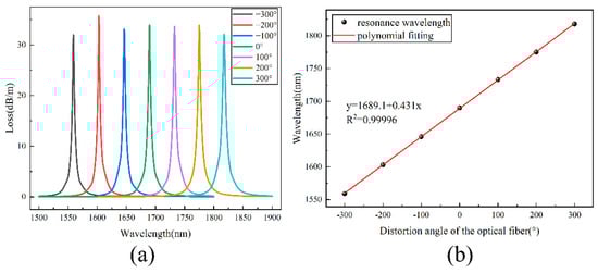 The loss spectra of the fundamental modes of the gold-film-coated HMSF with the additional twisting changing from −300° to +300° are shown in Figure 7a. The wavelength of the loss peak shifts with the change in the twisting angle and direction. With the increase in the twist angle along the positive direction, the resonance wavelength is red-shifted. When the twist angle increases along the negative direction, the resonance wavelength is blue-shifted. Taking the initial state as the reference value (0°), the linear fitting result of the sensitivity is shown in Figure 7b. It presents the relationship between the twist angle and the wavelength of the loss peak, and the linear fitting formula is as follows: