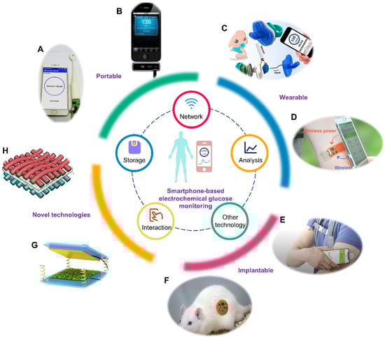 Herein, based on glucose concentrations under physiological and pathological conditions, the latest advances in smartphone-based point-of-care electrochemical glucose sensing in different biofluids are reviewed in Table 1. As shown in Figure 1, we introduce the technologies integrated in the smartphone which play important roles in the realization of electrochemical testing, including wireless networks, data analysis, storage, interaction with users and other technologies. The subsequent sections encompass the progress of smartphone-based electrochemical glucose monitoring systems in portable, wearable and implantable fields, respectively. Some novel technologies for glucose monitoring systems are also introduced. In each section, the basic configurations, active materials and the function of the smartphone in these sensing devices are illustrated sequentially. In the conclusion, we also discuss the unmet challenges to motivate further technological developments towards smartphone-based glucose monitoring in disease management.