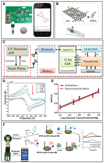 Because glucose level in blood is one of the most reliable indicators for diabetes monitoring, many studies focus on smartphone-based portable blood glucose monitoring in order to provide convenient, real-time and credible data for diabetes patients and clinics [2]. Ji et al. constructed a smartphone-based electrochemical system for sensitive detection of glucose using the cyclic voltammetric method [77]. The system included a smartphone, a portable electrochemical circuit board, and a functional material modified glucose electrode (Figure 2A,B). A smartphone was used to control the electrochemical module and display the detection result. Consisting of a potentiostat module, an energy transformation module, and a Bluetooth module, the portable electrochemical circuit detector was able to realize the electrochemical cyclic voltammetry test (Figure 2C). The glucose electrode was a screen-printed electrode modified with 3-amino phenylboronic acid and reduced graphene oxide. 3-amino phenylboronic acid was the sensitive substance which was able to combine with glucose molecules and which deterred electron transfer between the solution and the electrode. As shown in Figure 2D, when the glucose level increased, more glucose molecules combined with 3-amino phenylboronic acid on the electrode and then the currents decreased. Generated with the method of reducing the graphene oxide, reduced graphene oxide was utilized to improve the conductivity of the electrode and enhance the sensitivity of the glucose electrode. Integrated with these three components, the smartphone-based glucose sensing system realized glucose detection in the range of 0.1–10 mM, with the limit of detection at 0.026 mM [77]. The calibration curve showed high similarity to the contrast curve from a commercial electrochemical workstation in the same conditions (Figure 2E). Compared with the commercial glucometer, the error was only 3.2%, endorsing the accuracy of this system. Because of the cost-effective property, paper-based electrodes have been widely used to analyze ions, metabolites, proteins and nucleic acids. Therefore, a combination of paper-based equipment and smartphones has also become a trend in the glucose detection field. A smartphone-based electrochemical glucose sensing system with a paper-based electrode was developed for glucose measurement in phosphate-buffered saline [78]. When fabricating a paper-based electrode, a working electrode, reference electrode and counter electrode were directly drawn on the chromatography paper using the carbon pencil. Furthermore, glucose oxidase and potassium ferricyanide solution were dropped on the hydrophilic working electrode area. With the assistance of a miniaturized electrochemical circuit, the paper electrode realized glucose detection in the range of 0–10 mm. The detection data were transmitted through an audio jack to a smartphone and displayed on the smartphone screen. Furthermore, with dual enzymatic reaction channel technology, the smartphone-based electrochemical testing system realized the simultaneous measurement of blood glucose and blood ketone by one whole blood drop from a fingertip, which provided opportunities for clinical identification of diabetic ketosis and diabetic ketoacidosis on the basis of glucose monitoring [79]. In this research, two channels were designed on one proposed test strip, fulfilling the rigid demand for diabetic patients with diabetic ketosis/diabetic ketoacidosis without double pricking the finger to determine the blood glucose and blood ketone. A smartphone was used to control the electrochemical test in two channels, and analyze and display the result on the screen. Furthermore, the accuracy of this smartphone-based dual-channel electrochemical monitoring system was verified by the clinical test with good consistency. A commercial smartphone-based portable blood glucose monitoring system named iBGStar has been created by Sanofi and AgaMatrix, and cleared by the FDA in 2011 [51]. It was the first blood glucose meter that was assisted by an iPhone or iPod Touch. The device automatically realizes the data interaction with the iPhone or iPod Touch with an iOS Diabetes Manager app, and provides users with direct access to data on their mobile device. Through simply tapping the share icon, the users can share data to their health professionals, family, or friends.