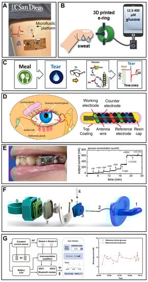 As the most readily obtainable biofluid from sweat glands distributed all over the body, sweat provides accessible sampling sites. In order to realize wearable sweat glucose analysis, the relatively lower concentration than blood and the difficulties in obtaining a sufficient amount of sample collection need to be considered fully. Sweat generation is usually accomplished through exercise or iontophoretic stimulation. Aida et al. developed a skin-mounted microanalytical sweat metabolites monitoring system for continuous real-time monitoring of lactate and glucose in human sweat with the help of epidermal technology (Figure 3A) [90]. The glucose sensor was fabricated through screen-printing. A reference electrode was printed using silver silver/chloride ink. Then, glucose oxidase was mixed with carbon Prussian blue ink and used to print the working electrode. This screen-printed flexible senor enabled glucose monitoring in sweat from 2 to 10 mM with a limit of detection of 50 μM. Considering the matching mediums between sweat and the glucose sensor, this study designed a microfluidic platform. In simulation testing, this microfluidic platform sped up sweat flow rate and shortened the device filling time. Meanwhile, it endured repetitive mechanical deformations experienced by the epidermis. The wearable system was successfully applied to monitor glucose and lactate levels during cycling activity of different healthy subjects. Most wireless smartphone-based sensors usually need on-board batteries, which often restrain the miniaturization of the system. Xu et al. proposed a NFC technology-supported wireless epidermal electrochemical system as a battery-free design for sweat biomarker detection including glucose [20]. The fully integrated system could realize wireless energy harvesting and data transmission with smartphones. Indeed, successful on-body monitoring of glucose, H+, Na+ and K+ was fulfilled by this battery-free and wireless system. However, the immobilized enzymes could induce some critical problems. Specifically, the activity of enzymes could be affected by environmental factors that cannot be well controlled under in situ monitoring. The degradation of enzymes could also affect the shelf life and the long-term monitoring possibility of sensors. Moreover, the immobilization of enzyme on the electrode might decrease the activity of the enzyme and slow down the electron transfer. Herein, Zhu et al. proposed a fully integrated wristband equipped with a nonenzymatic wearable sensor for continuous electrochemical analysis and real-time glucose monitoring. The system could realize a linearity response correlated to glucose concentration from 30 to 1100 μM. This wristband monitored the perspiration glucose during physical activity, and uploaded the test results to a smartphone application via Bluetooth [91]. Katseli et al. combined optical and electrochemical techniques and fabricated a single-step 3D-printed e-ring as a solution to wearable noninvasive glucose detection in sweat (Figure 3B) [92]. The e-ring could resist mechanical bending and enabled detection in the physiological concentration range of glucose within 12.5–400 μM. Moreover, the e-ring was shown to successfully track the glucose level variation before and after a meal.