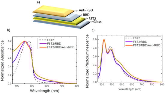 (a) Assembly diagram of the optical biosensor configuration GLASS/F8T2/RBD/anti-RBD. Optical properties of films for the optical biosensor construction: (b) normalized absorption spectrum; (c) normalized photoluminescence spectrum (excitation at 450 nm). Absorption and photoluminescence spectra of the F8T2 film were plotted by comparison.