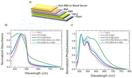 (a) Assembly diagram of the optical biosensor configuration GLASS/F8T2/RBD/BSA/anti-RBD. Optical properties of films for construction of the optical biosensor: (b) normalized absorption spectrum; (c) normalized photoluminescence spectrum (excitation at 450 nm). Absorption and photoluminescence spectra of the F8T2 film were plotted by comparison.