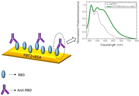 When used in biosensors, conjugated polymers convert a biochemical signal resulting from the interaction of a biological component into a measurable signal [18,33,34]. Studies show that the binding of a specific antibody to the antigen can transfer electrons to these materials through redox or enzymatic reactions [35]. In this case, the electron transfer to F8T2, through binding of the RBD antigen to the anti-RBD, generated a more significant emission in the region from 565 nm to 750 nm, leading to an understanding that this structure provides a possible means of detecting the antibody of the infectious disease caused by the new coronavirus via photoluminescence spectroscopy.
