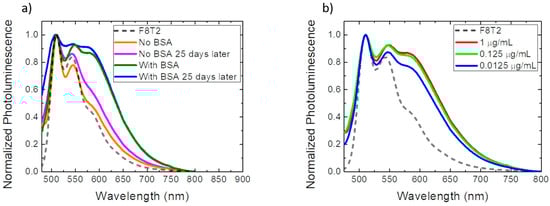 (a) Normalized photoluminescence spectrum of the optical biosensor for stability study; (b) normalized photoluminescence spectrum of the optical biosensor for the study of the concentration. The photoluminescence spectrum of the film with F8T2 was plotted by comparison.
