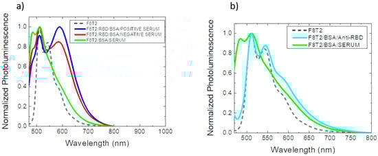 In this comparison, shown in Figure 5a, it is notable that the interaction of the serum with the whole system behaved differently from the previous case. First, the measurement performed on the film composed of F8T2/BSA/SERUM exhibited a high interaction of the serum with the F8T2 transducer, with a peak at 483 nm in its photoluminescence spectrum. This strong interaction was not observed in the previous experiment, which used purified anti-RBD, as shown in Figure 5b. The purified anti-RBD guaranteed the presence of only the desired antibody in the samples. Therefore, as serum contains several components, such as water, proteins, peptides, electrolytes, organic residues, and a variety of other small molecules [37], these components showed a more significant interaction with F8T2 in this region, making this peak irrelevant for the study of antigen/antibody interaction.