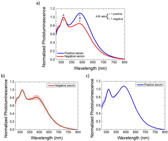 Finally, for a better comparative analysis, the sensing devices that use negative and positive sera also underwent an evaluation of the influence of their concentration, as shown in Figure 6b,c. For this analysis, the sera were diluted 1000 and 3000 times. It was possible to observe, in addition to the persistence of the peak proportions, the high sensitivity due to the small variation in the photoluminescence spectrum.