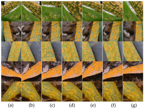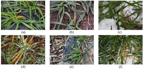 Examples of winter wheat infected by stripe rust with complex backgrounds: (a) film mulching; (b) soil; (c) snow cover; (d) weeds; (e) dried leaves; and (f) overlapping.