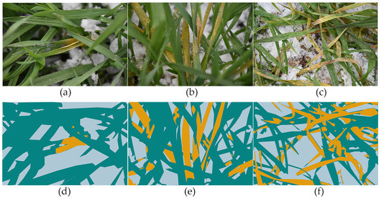 (a–c) Three samples of wheat leaves; and (d–f) annotation of healthy wheat (blue) and infected wheat (yellow) areas.