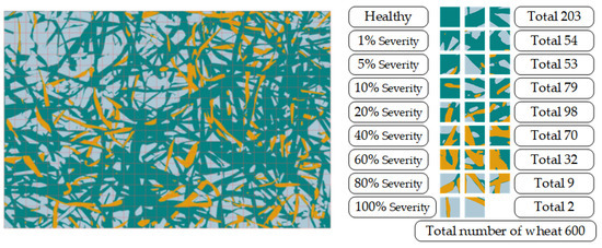 where is the macro disease index; is the macro severity level of disease, which is the proportion of the WSR area to the wheat area per unit, with 8 grades (1%, 5%, 10%, 20%, 40%, 60%, 80%, and 100%); is the number of units at macro severity level grade i; n is the highest-level representative value (here, it is 100%); and is the total number of units containing wheat classes. For example, as seen in Figure 5, the resolution of the original image in this study is 3000 × 2000 pixels, which means that the actual area of the ground was about 1.2 square meters. This is divided into 600 unit areas (each of size 100 × 100 pixels), and the unit areas containing wheat classes (healthy class + rust class) were counted one by one, as well as the macro severity level value per unit (area), and its corresponding quantity, in order to calculate the macro disease index, which is used to represent the average level of disease occurrence in a certain area.