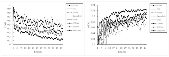 The original data set and cross-entropy loss function were used to construct the baseline model, in order to assess the performance of the different algorithmic models. The results of the training process are shown in Figure 6. Segformer presented the smallest and fastest decreasing training loss and the highest mIoU in each epoch of the validation process.