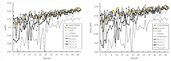To solve the problem of a class-imbalance in the data set, we compared the performances of various loss functions, including cross-entropy loss (CE), dice loss, boundary loss [30], ohem-cross-entropy loss [31], Lovász-Softmax loss [32], and focal loss [33], which are considered to perform better in cases characterized by difficult sample identification and class imbalance problems.