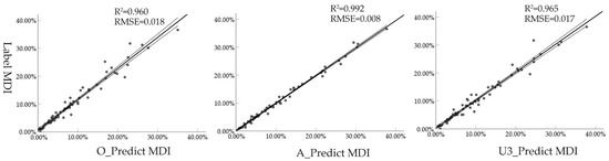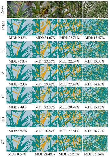 Seventy original images from the independent test data set were selected and identified using the models built with the different data sets (based on the mixed loss function). Then, the macro disease index of the predicted images was calculated and compared with the results obtained through manual labelling. The results (Figure 9) indicated that the model based on the data set A had the best performance, with a coefficient of determination (R2) of 0.992; this outcome is consistent with the visual assessment and F1 score results. This also suggests that the MDI index is suitable as a quantitative indicator describing a range of disease indices based on segmentation results. In practical applications, a certain ground area should be maintained in different pictures.