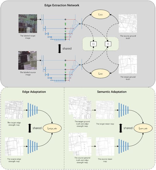 To reduce the need for the number of samples, domain adaptation methods reuse samples that are not in task domains by reducing the distribution shift between different task domains [9]. In these methods, the task domain with labels that can fully train the model is usually known as the source domain, and the task domain with no labels or only a few labels is called the target domain. Due to the differences in the distribution of the ground objects, shooting angles, lighting effects, and image sources between the source and target domains in the remote sensing field, simply using the source domain samples as the train samples in the target domain task will greatly reduce the extraction performance of existing methods [10]. By reducing the distribution shift caused by these differences, the source domain samples can be effectively used in the target domain. Currently, unsupervised domain adaptation (UDA) has been widely used in image processing tasks such as classification and semantic segmentation. There are also methods that propose semisupervised domain adaptation (SSDA) methods [11,12] to further improve this effect. However, as far as we know, there is still no method to use domain adaptation in edge detection.