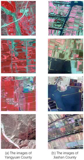 Sample images between (a) Yangyuan County and (b) Jiashan County. The distance between the two selected regions is approximately 2000 km. Yangyuan County is in a basin with a wide distribution of mountainous areas. Jiashan County is in a plain, with a large proportion of water. There are obvious differences in the topography and landforms of the two places.