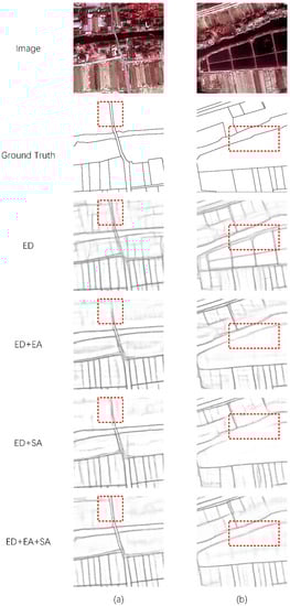 As shown in Table 1, better results can be obtained by using the EA module and the SA module together. Thus, every module is necessary for our method. As shown in Figure 3, we selected some representative results from the test results. We can see that the difference between the training sets of the two domains causes the ED module to detect the edges of many nontarget objects. After adding the EA module or SA module to the ED module, this problem is largely alleviated, but blurred edges are still detected in some complex areas. We combine the two so that the method can obtain satisfactory edge extraction results in these regions.