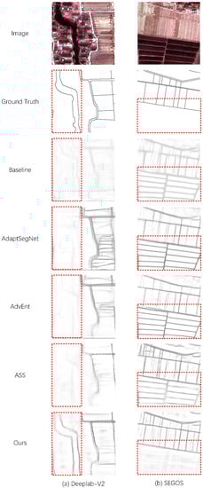 One of these ideas is adversarial learning [9,13,14,15], which uses an extractor to extract the same features from different task domains, and a discriminator to identify data from different task domains. The two play against each other, thereby reducing the domain differences between the two domains. The typical method is AdaptSegNet [14], which is the first domain adaptation method to adopt adversarial learning in the output space. Based on this, Vu, Jain, et al. [33] proposed a method for adversarial entropy, using entropy as a measure for unsupervised adversarial learning. Although these two methods do not use the target domain samples, there are still obvious noises in the results, which lead to blurred edges. ASS [34] is the first work on SSDA for semantic segmentation and performs semantic adaptation pixel by pixel. However, the pixel-by-pixel adversarial method ignores the correlation between edge pixels and cannot be effective in edge extraction. Such methods can theoretically be applied to most tasks, but the strong generalization of edges in edge detection tasks will lead to more incorrect detections. Therefore, adjusting the mainstream methods used in semantic segmentation is necessary.
