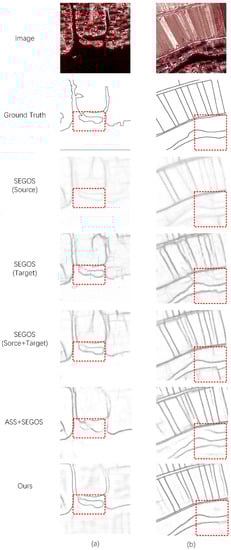 As seen in Table 3, for fully supervised edge detection methods, even if the number of samples is much larger than the target domain samples, the training effect of the target domain samples is not as good. Very few samples in the target domain cause the network to be unable to train sufficiently. Moreover, mixing source domain samples and target domain samples may yield different results depending on the network structure. In contrast, ASS makes the source domain samples more stable in the target domain. Our proposed method adds the transfer of more semantic information, which has a greater improvement than the semisupervised methods.