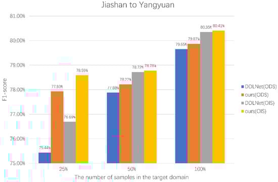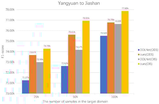 The last set of experiments verifies the edge detection of our method by using different numbers of target domain samples in different transfer directions. Our method performs domain adaptations from Yangyuan County to Jiashan County and from Jiashan County to Yangyuan County. Additionally, SEGOS is trained only with samples from the target domain. All samples from the source domain will be used, and 25%, 50%, and 100% of the target domain samples will be used for training.