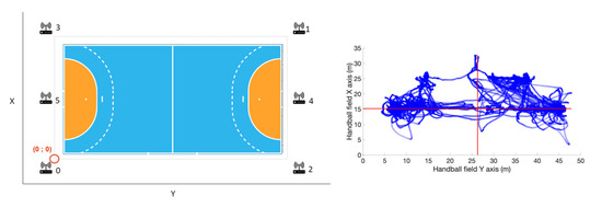 Each sensor has a number and is affiliated with the same player for the entire season to limit problems that may exist due to inter-unit reliability of the sensors. The configuration used in this data collection is six antennas positioned around the field with the (0;0) coordinates corresponding to a corner outside the field (Figure 1, left panel). As mentioned in the study by Bastida-Castillo et al. [13], the way this LPS UWB system works is that it is composed of two subsystems: the reference system which is composed of the antennas that act as radio transmitters and receivers and the sensors carried by the participants. The system obtains the position of the sensor via triangulation of its position between the antennas and thus obtains its position in X and Y.