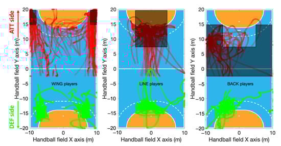 During an ATT, wing players are detected as the players with the highest density of positions in an area from each sideline to 2 m inside the field, when they have a position beyond 15 m on the attacking side (from the goal line of the opposing team to 5 m inside the field on the Y axis) (Figure 2 left panel).
