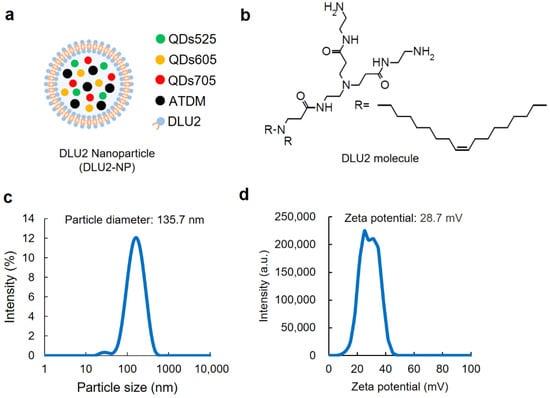 The concentrations of DLU2 molecules, QDs, and ATDM contained in DLU2-NPs are shown in Table 1. The distribution of the particle diameter and zeta potential of DLU2-NPs is shown in Figure 1c,d. The average particle diameter and zeta potential of DLU2-NPs were 135.7 nm and 28.7 mV, respectively.