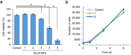 DLU2-NPs were diluted 1:100 using PBS, and the particle size and zeta potential were measured by dynamic light scattering (DLS) using the Zetasizer Nano ZS (Malvern Instruments, Ltd., Herrenberg, Germany). These measurements were performed at 25 °C.