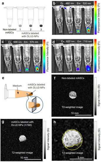 In vitro fluorescence and MR imaging of ASCs labeled with DLU2-NPs. In vitro fluorescence images of ASCs (3 × 106 cells) labeled with various concentrations of DLU2-NPs (640, 320, 160-dilute solution), excitation: 460–620 nm, emission: 520–710 nm (a–d). In vitro MR imaging of ASCs labeled with DLU2-NPs (e–h).