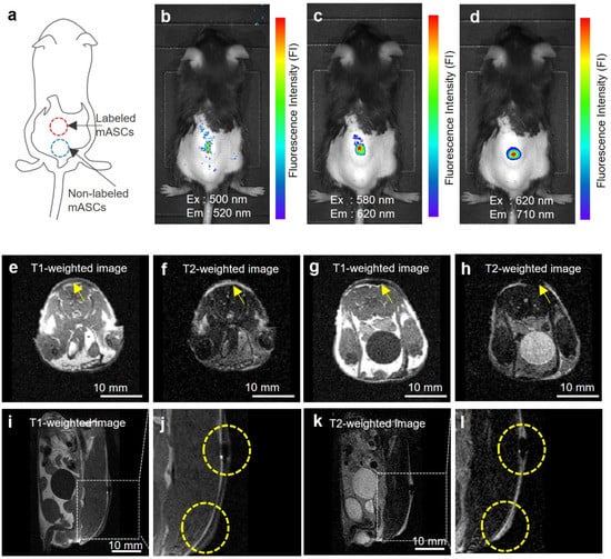 In vivo fluorescence and MR imaging of ASCs labeled with DLU2-NPs. In vivo fluorescence images of ASCs (3 × 106 cells) labeled with DLU2-NPs (320-dilute solution) after subcutaneous transplantation onto the back of a mouse, excitation: 500–620 nm, emission: 520–710 nm (a–d). In vivo MR images of labeled ASCs, the transversal images of non-labeled ASCs (e,f), labeled ASCs (g,h), the sagittal images (i,j,k,l), T1-weighted image (e,g,i,j), T2-weighted images (f,h,k,l). (j,l) are enlarged images of (i,k). Yellow arrows and dotted circles indicate the locations where ASCs were transplanted.