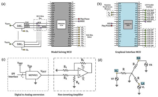 Our ECG patient simulator implements a 320 × 240-pixel color TFT LCD touch screen, which provides a friendly graphical user interface (GUI) to select mathematical models, cardiac rhythms, and parameters. By using a microcontroller STMF103C8T6 operating at 72MHz and belonging to the ARM Cortex-M3 Core family, we can control the pixels on the LCD screen and scan messages from the touch screen through a parallel bus and two resistive terminals, respectively (see Figure 1b). Information scanned from the TFT touch screen by the slave MCU (STMF103C8T6) is sent to the master MCU (STM32F401CCU6) via SPI protocol. These data allow us to specify the mathematical model and cardiac rhythm that will be solved numerically in the master MCU. The output ECG waveforms are converted to a quasi-analog signal by using DACs. Since the DAC operates voltages on the order of millivolts, the internal noise may adversely affect its performance. To aleviate this, we first include a bypass capacitor to minimize the effect of noise sources on signal integrity, and second, we generate ECG waveforms with amplitudes ten times greater than real ECG amplitudes, including offset levels that simulate baselines. In addition, to simulate ECG waveforms with physiologically consistent amplitudes, the output signals of the converters are passed through a non-inverting amplifier stage, encompassing general-purpose operational amplifiers and resistors (R , R , R , and R ) for producing a differential output signal, as described in Figure 1c. This amplifier provides low offset voltage and low noise. With this design, we can produce ECG waveforms within the range of 0.5 mV to 4 mV with low noise and minimum offset effects.