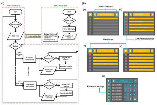 (i) Flowchart of the ECG patient simulator for both microcontrollers, STM32F401CCU6 and STM32F103C8T6. (ii) Graphical user interface, where different screens to interact with the user were implemented: (a) model selection, (b) arrhythmia selection, (c,d) play/pause generation of ECG waveforms, and (e) parameter settings.