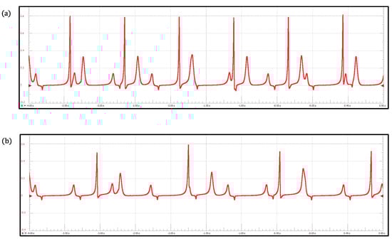Normal synthetic ECG signals generated by the proposed ECG patient simulator are presented in Figure 3iii. Table 1 shows the parameter values for reproduce these cardiac rhythms. We obtain a full 12-lead ECG profile by integrating the heterogeneous oscillator model of the cardiac conduction system as shown in Figure 3iii(a). An ECG waveform (standard Einthoven lead II) generated with the discretized BVAM model is shown in Figure 3iii(b). The normal ECG waveforms produced by the model based on a ring of three coupled oscillators and the model based on a quasiperiodic motion are shown in Figure 3iii(c,d), respectively. Notably, the ECG signals presented in Figure 3iii(b,d) exhibit the characteristic peaks and troughs of the ECG waveform, i.e., the P wave, QRS complex, and T wave. These events are associated with the successive atrial depolarization/repolarization and ventricular depolarization/repolarization, which occurs with every heartbeat. It should be said that the discretized reaction–diffusion model and the ring of three coupled oscillators can only reproduce general features of the normal ECG, though they are capable of generating different arrhythmias effectively. On the contrary, the network of heterogeneous oscillators and the model based on a quasiperiodic motion incorporate substantial details in the simulated signals that lead to realistic ECG waveforms, but the complexity of the models increases.