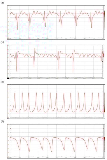Figure 6 shows four arrhythmias generated by the discretized reaction–diffusion model: (a) sinus tachycardia, (b) atrial flutter, (c) ventricular tachycardia, and (d) ventricular flutter. The corresponding parameter values are presented in Table 2. Sinus tachycardia is a cardiac rhythm characterized by a faster-than-usual heartbeat. Similarly, atrial flutter refers to a condition in which the upper chambers beat too quickly. However, the former condition is generally not dangerous, but the second one produces insufficient blood pumping, which can lead to heart failure [56,57]. Lethal cardiac arrhythmias frequently result from reentry mechanisms; specifically, ventricular tachycardia and ventricular flutter are re-entrant ventricular tachyarrhythmias that can progress to ventricular fibrillation. Ventricular tachycardia occurs when the lower chamber of the heart (ventricles) beats faster than 120 beats/min, whereas ventricular flutter is a rapid organized rhythm, between 250 and 300 beats/min, characterized by a sine wave pattern on the electrocardiogram without any identifiable QRS complexes or T waves [58,59].