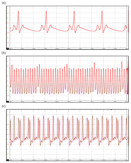 By integrating the model (6) in the proposed device, we reproduce three pathological rhythms: sinus bradycardia, atrial flutter, and ventricular fibrillation, which are shown in Figure 7. Sinus bradycardia is a common heart rhythm defined by a slow, regular heartbeat of fewer than 60 beats/min [56]. In contrast, ventricular fibrillation is a severe and totally disorganized rhythm that leads to death if no immediate medical attention is provided [59]. Interestingly, ventricular fibrillation has been associated with chaotic behavior; this fact has motivated the investigation and development of new devices to control it. In this context, ECG simulators have provided a significant tool to design and test these devices [60,61,62]. The parameter values corresponding to the three pathologies are shown in Table 3.