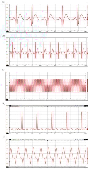 ECG waveforms obtained with the extended dynamical model based on a quasi-periodic motion: (a) Bradycardia, (b) Tachycardia, (c) Ventricular Flutter, (d) Atrial Fibrillation, and (e) Ventricular Tachycardia.
