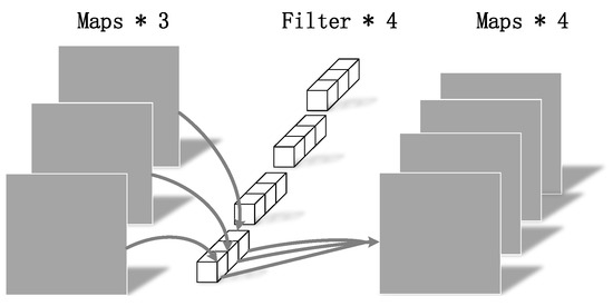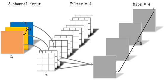 As shown in Figure 4, Figure 5 and Figure 6,where represents the height and width of the input matrix, represents the size of the convolution kernel, M is the number of input feature matrix channels, and N is the number of output feature matrix channels: