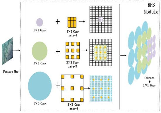 The RFB module processing flow is shown in Figure 8. The RFB module consists of three branch modules [22]. The bottom layer in each branch is processed by convolutional nuclei of 1 × 1, 3 × 3, and 5 × 5. Finally, three different receptive fields are obtained [23,24].