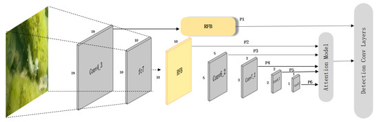 In this paper, the features of the Conv4_3 and FC7 layers are selected to utilize RFB. Finally, P1(19 × 19), P2(10 × 10), P3(5 × 5), P4(3 × 3), P5(2 × 2), and P6(1 × 1) feature maps are obtained [32]. The improved SSD network structure is shown in Figure 9.