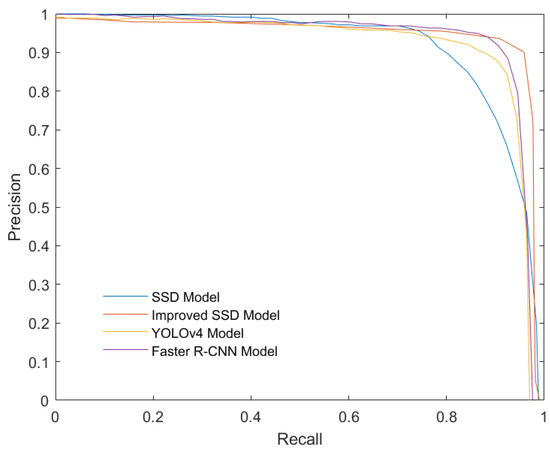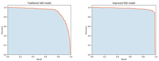 As shown in Figure 11, the improved SSD model has the larger area between the P-R curve and coordinate axis. The equilibrium point of the improved SSD model is closer to coordinate (1,1), indicating that the system performance of the improved SSD model is better.