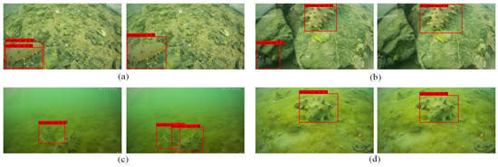 Figure 12 shows the comparison images of sea cucumbers detected by the SSD model before and after improvement. As shown in Figure 12a, the result of the traditional SSD algorithm has a repeat box. As shown in Figure 12b, the result of the traditional SSD algorithm has a false detection. As shown in Figure 12c, the result of the traditional SSD algorithm reveals a missed detection. The comparison results in Figure 12d show that the confidence of the improved SSD algorithm has increased by 12%. According to the results in Figure 12, the proposed algorithm reduces the missed detection rate. Compared with the traditional algorithm, the confidence of the proposed algorithm is higher. In addition, the portion of the target missed by the traditional SSD algorithm can be detected by the proposed algorithm.