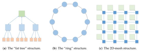Each signal processing method generally has multiple different processing flows, and the same or different signal processing methods may have the same processing unit. A network-on-chip (NoC) is used to connect different resources in the form of a network. Both have certain similarities. We regard each operation of signal processing as a resource, and use the idea of a NoC to connect these resources. Therefore, to realize the reuse of resources and improve the utilization rate of resources, we have studied several common structures of NoC systems. Traditional single-chip processors use a bus-type on-chip network structure. When an operation occupies bus resources, other operations cannot be performed. This structure performs poorly in parallelism. The “fat tree” structure [21] adopts a tree-like structure. The computing unit is located at the leaf position of the tree, and the branches of the tree are used for addressing the problem, as shown in Figure 2a. The structure is simple, but the flexibility is poor, and thus, it is not suitable for large-scale parallel processing scenarios. The “ring” and the improved structure [22] adopt a ring structure, as shown in Figure 2b. When the number of ring nodes increases, the network diameter increases, and the communication delay increases. This structure is prone to blocking parallel signal processing. The 2D-mesh structure [21] is one of the most widely used NoC structures, as shown in Figure 2c, which adopts a two-dimensional array. It is more flexible and has better parallelism. However, the routing design is more complex, and routing takes up more resources. The Torus structure [23] adds ring routing to 2D-mesh, which further improves routing flexibility and consumes more resources for routing.