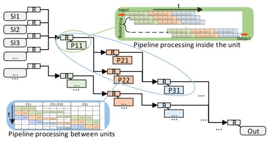 We evenly distribute the original signal to be processed by in Equation (4) to . We then loop through all until all meet the above conditions. Then, these processing units are connected by pipeline units in processing order.