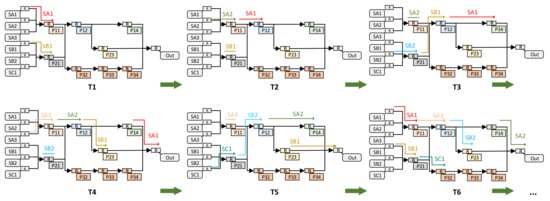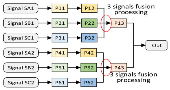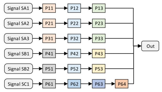 Assuming that these same processing units meet the constraints of the spatially optimal resource allocation method, the structure of the independent multi-signal processing method after the spatially optimal resource allocation method is shown in Figure 5. In order to improve the utilization of coordinate IDs, we rearranged the IDs in Figure 4. First of all, we divided the signals with the same processing operation into a group; then, the 6 signals can be divided into 3 groups, , and , as shown in Equation (11).