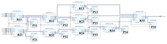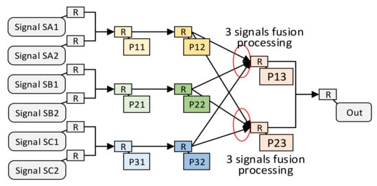 Except for the above-mentioned multi-signal independent situation, multi-signal fusion processing is also common in signal processing. We use an example of multi-signal fusion processing to show the structure of multi-signal fusion processing. Suppose there is such a requirement for multi-signal fusion processing, as shown in Figure 6. Signal SA1 first passes through processing units P11 and P12. Signal SB1 first passes through processing units P21 and P22, and signal SC1 first passes through processing units P31 and P32. Then, signal SA1, SB1, SC1 are, respectively, input into the P13 fusion processing unit to obtain the processing result. Assuming that these same processing units meet the constraints of the spatially optimal resource allocation method, the structure of the independent multi-signal processing method after the spatially optimal resource allocation method is shown in Figure 7. Due to the uncontrollable routing delay, multiple groups of signals that need to be merged and processed may not arrive at the fusion processing unit in sequence. Therefore, in order to avoid functional errors, we do not merge the fusion processing units P13 and P23.