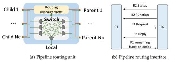 Traditional NoC routing units generally have complex arbitration mechanisms, data buffers, etc., which occupy a large amount of resources. In order to meet the routing addressing requirements of irregular topologies and reduce the resource occupation of traditional NoC routing units, we have designed a resource-saving pipeline routing unit that can be flexibly tailored, as shown in Figure 8a. The unit consists of multiple groups of child interfaces (), multiple groups of parent interfaces (), local interfaces, switch switches, and routing management units. The structure of the child and parent interface mainly includes a data interface and routing interface. The data interface is responsible for data transmission, using the AXI bus of Xilinx; the child is the slave, and the parent is the master. The local interface is responsible for connecting with processing resources and also uses the AXI bus for data transmission. The switch is responsible for establishing the connection between child, parent and local processing resources. The routing interface is responsible for routing addressing and routing establishment, as shown in Figure 8b. “R2 Status” represents the current status of route R2; “R2 function” represents the function code of the processing unit connected to route R2 and is also the coordinates of route R2. “R1 Request” represents route R1 sending a connection request to R2; “R2 Reply” represents the result of routing R2’s reply to R1. “R1 remaining function codes” represents the remaining operations of the packet sent by routing R1.