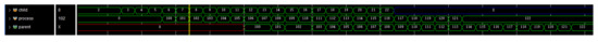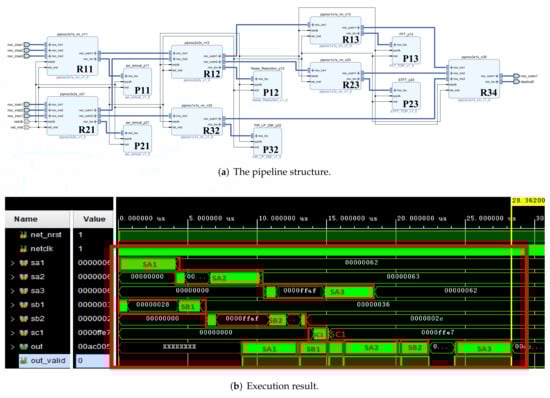 The allocation of all processing units met the requirements of the space-optimized resource allocation method. Then, we obtained the pipeline structure shown in Figure 15a, and the execution results are shown in the Figure 15b. The red text and boxes in the figure represent the input and output positions of the signal on the time axis.