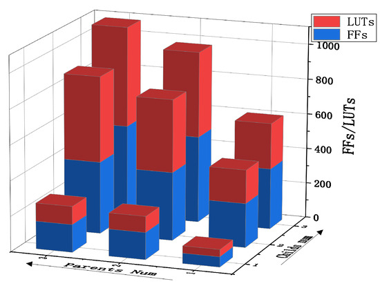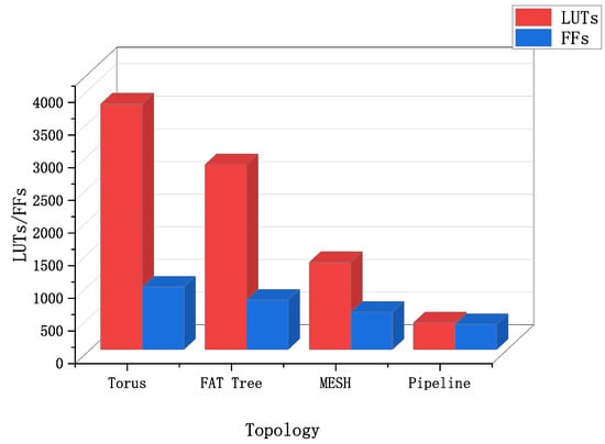 The pipeline routing unit can quickly obtain new routing units with different numbers of child and parent interfaces by cutting. The resource occupation of routing units with different numbers of interfaces is shown in Figure 10. Using routing units with a corresponding number of interfaces in actual use will reduce resource waste. Compared with the traditional routing unit structure of the network-on-chip, the pipeline routing unit saves a lot of resources due to its simple structure. According to reference [24], we compare the routing unit structure and pipeline routing structure of the traditional on-chip network, as shown in Figure 11. Under the same condition with 4 interfaces, the pipeline routing unit consumes the least resources. The LUTS of the pipeline routing only occupies 30.8% of the “MESH” routing. The FFS of the pipeline routing only occupies 67.2% of the “MESH” routing.
