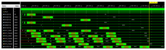 Based on the structure of Figure 5, we built a pipeline processing system as shown in Figure 13 in vivado to verify the pipeline processing function of the system. In order to facilitate verification, all processing units use multiplication and addition operation units with the same function and different IDs. Part of the simulation results are shown in Figure 14. The process of multi-signal processing is addressed, processed and transmitted according to the coordinate addressing method of our design of irregular topology. The figure shows the process of part of the signal passing through different signal processing units.