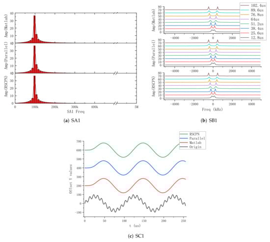 Among them, SA1, SA2, SA3, SB1, and SB2 have the same sampling rate, and need to perform the same denoising reduction operation; SA1, SA2, SA3 have the same single processing data length, amplitude transformation operation (), and the same FFT operation; SB1, SB2, SC1 have the same amplitude transform operation (); and SB1, SB2 have the same single processing data length and the same STFT operation. The times below each processing operation are estimated processing times with a system clock of 250 MHz. We use the RSCPN, parallel structure and computer, respectively, to implement the above multi-signal processing, and then compare the resource consumption, execution time and execution results of the three methods.