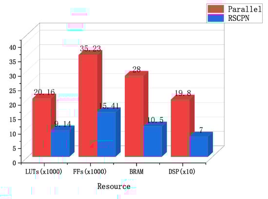 A traditional parallel processing system with FPGA is suitable for multi-channel, high-rate scenarios. However, as the number of signal processing channels increases, the resources occupied by this method are correspondingly doubled. The RSCPN designed in this paper can avoid this situation. However, with the increase in the number of signal processing channels, the resources occupied by the RSCPN designed in this paper will also increase, although the increase will be lower than that of the FPGA parallel signal processing system.